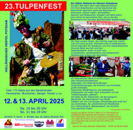 Über 160 niederländische Teilnehmer gestalten mit uns Brandenburgern dieses Fest. Handwerker, Musiker, Sänger, Tänzer und weitere Darsteller lassen wieder niederländisches Lebensgefühl im Holländischen Viertel wahr werden. Veranstalter ist die COEX Veranstaltungs GmbH und Co. KG mit Unterstützung durch unseren Förderverein.